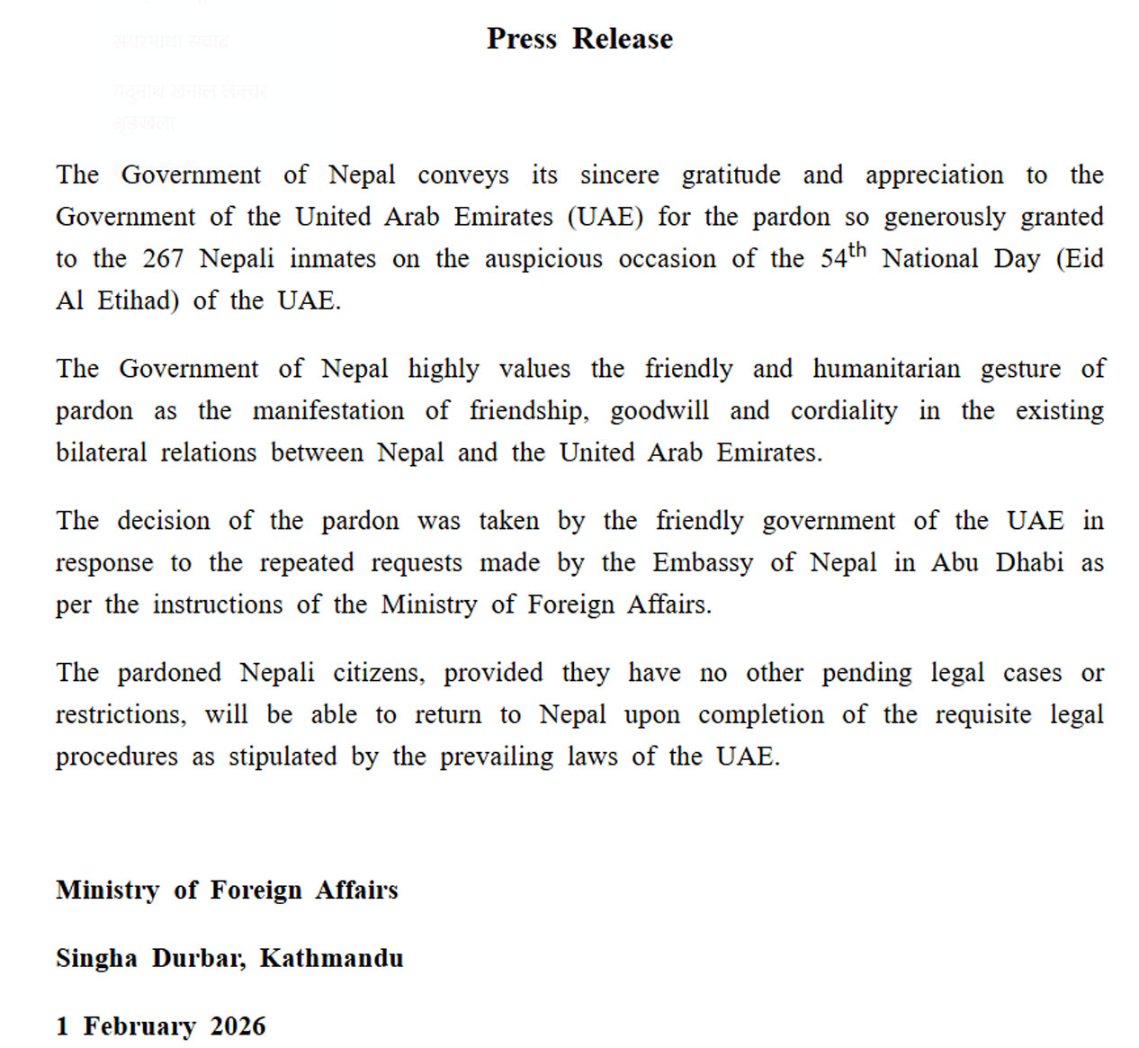 काठमाडौँ। नेपाल सरकारले संयुक्त अरब इमिरेट्स (यूएई) सरकारको ५४औँ राष्ट्रिय दिवस (इद अल एतिहाद) का अवसरमा २६७ जना नेपाली बन्दीलाई उदारतापूर्वक प्रदान गरिएको आममाफीप्रति यूएई सरकारप्रति कृतज्ञता व्यक्त गरेको छ।