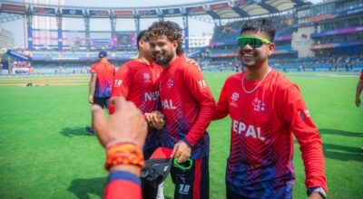 काठमाडौँ। आईसीसी टी-२० विश्वकपको डेब्यु खेलमै नेपालका शेर मल्लले विकेट लिएका छन्। इङ्ल्यान्डविरुद्धको खेलमा उनले डेब्यु गरेका हुन्। उनले डेब्यु ओभरमै विकेट लिएका हुन्। मल्लले लेगमा फिल्ड साल्डलाई फ्लिक आउट गरेका हुन्। साल्टले ब्याकवर्ड स्क्वायर लेगमा स्विङ गर्न खोजेका थिए। तर, लिडिङ एज पाए। उनलाई सन्दीप लामिछानेले क्याच गरे। २ बल खेलेका साल्डले एक रन … Continue reading आईसीसी टी-२० : डेब्यु खेलमै विकेट