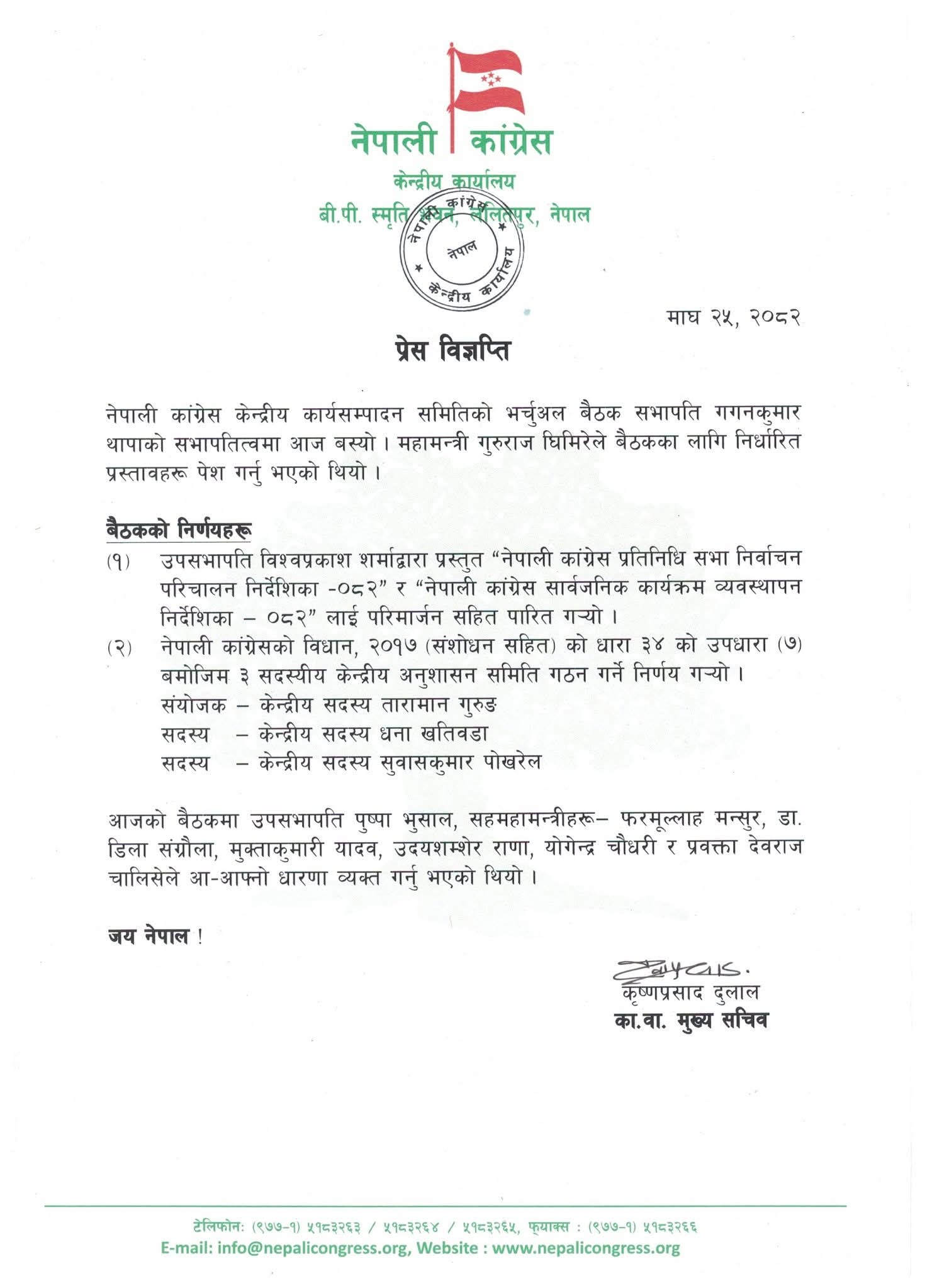 बैठकले उपसभापति विश्वप्रकाश शर्माले प्रस्तुत गरेको ‘नेपाली कांग्रेस प्रतिनिधिसभा निर्वाचन परिचालन निर्देशिका-२०८२’ र ‘नेपाली कांग्रेस सार्वजनिक कार्यक्रम व्यवस्थापन निर्देशिका २०८२’ लाई संशोधनसहित पारित गरेको कार्यवाहक मुख्यसचिव कृष्णप्रसाद दुलालले जानकारी दिएका हुन्।