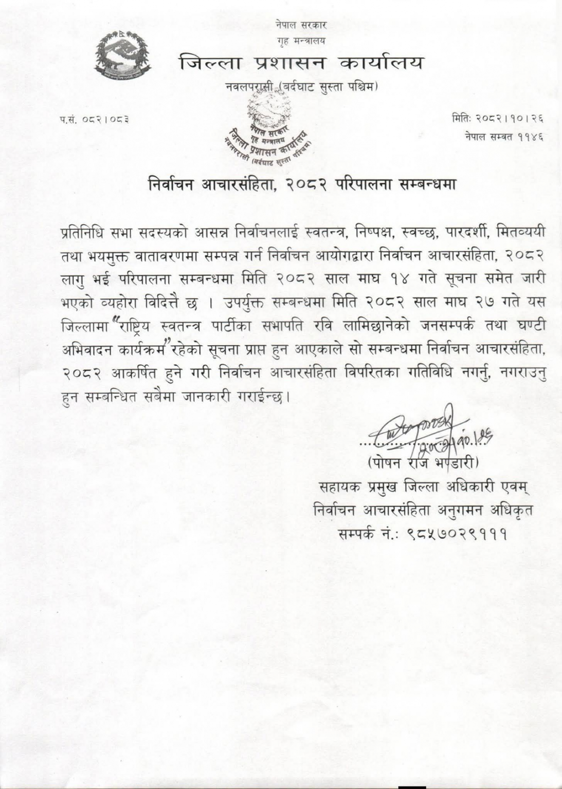 रुपन्देही। जिल्ला प्रशासन कार्यालय नवलपरासी पश्चिमले राष्ट्रिय स्वतन्त्र पार्टी (रास्वपा) का सभापति रवि लामिछानेलाई निर्वाचन आचारसंहिता विपरीत कार्यक्रम नगर्न आग्रह गरेकाे छ।