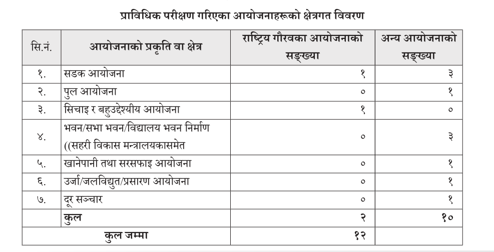 विकास निर्माणसम्बन्धी आयोजनाको प्राविधिक परीक्षण गर्ने जिम्मेवारी पनि केन्द्रकै हो। केन्द्रले गएको वर्ष १२ वटा विकास निर्माणसँग सम्बन्धित आयोजनाको प्राविधिक परीक्षण गरेको जनाएको छ। परीक्षणपछि ती आयोजनामा कमजोरी दोहोरिन नदिन, प्राविधिक परीक्षणका क्रममा दिइएका सुझाव कार्यान्वयन गर्न निर्देशन दिएको थियो।