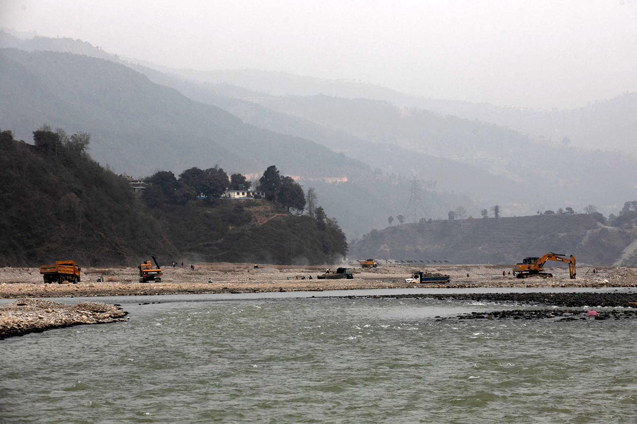 सिन्धुपाल्चोकस्थित इन्द्रावती खोलाबाट निर्माण सामग्री उत्खनन गरिँदै। तस्बिर : बिक्रम राई