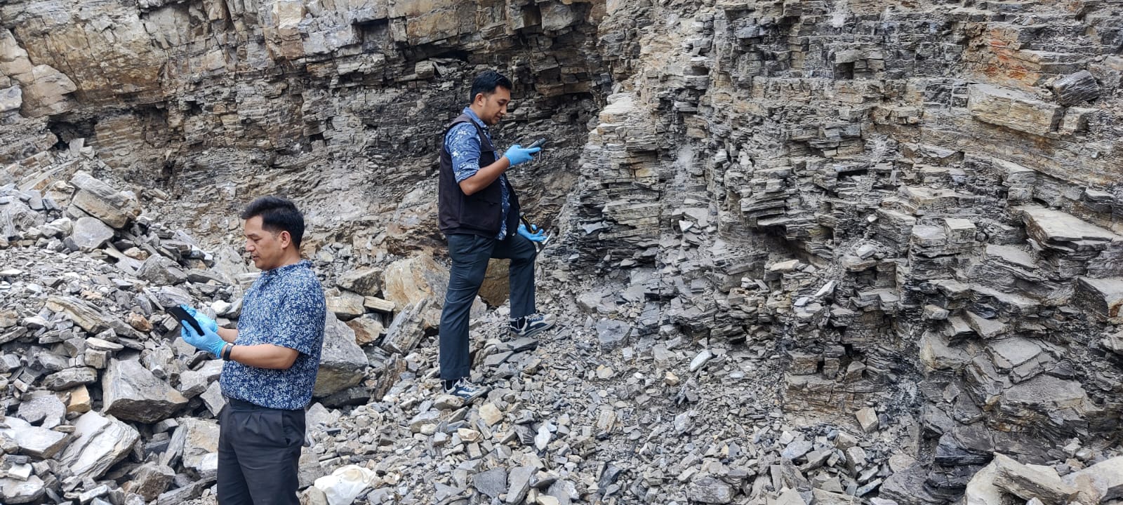 पाल्पामा ढुंगा खानीको अध्ययन गर्दै खानी तथा भूगर्भ विभागका कर्मचारीहरू। तस्बिर : खानी तथा भूगर्भ विभाग