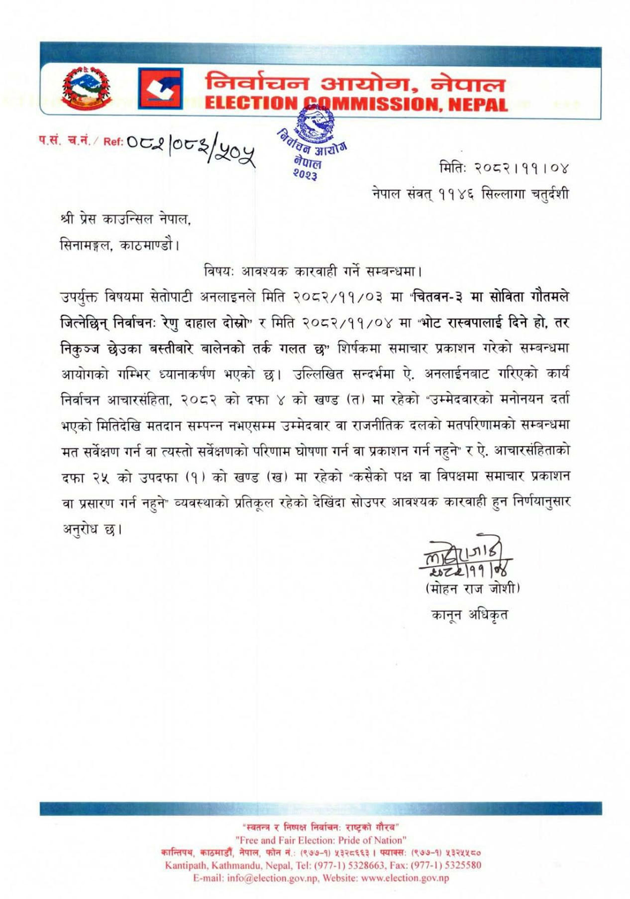 आचारसंहिताविपरीत सेतोपाटी डटकममा प्रकाशन भएका दुई समाचारका विषयमा आवश्यक कारबाही गर्न निर्वाचन आयोगद्वारा प्रेस काउन्सिललाई पत्राचार