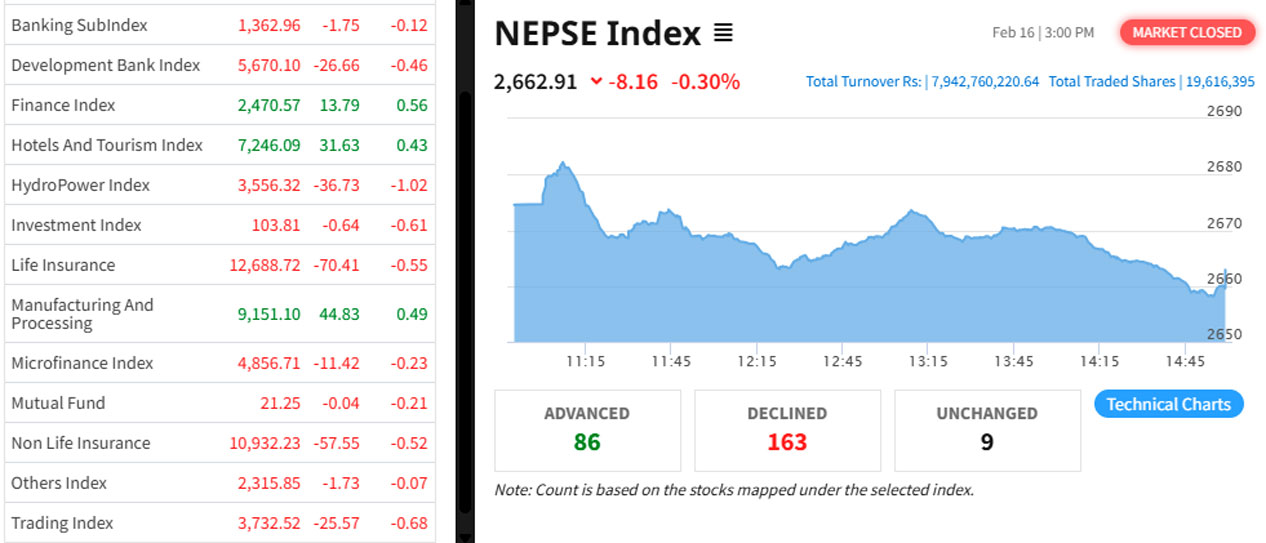 ८.१६ अंकले घटेको नेप्से २‚६६२.९१ विन्दुमा अडिएको छ। अघिल्लो कारोबार दिनको तुलनामा नेप्से ०.३० प्रतिशतले घटेको हो। फागुन १ गते शुक्रबार‚ २ गते शनिबार र ३ गते आइतबार परे पनि शिवरात्रिको बिदाका कारण नेप्से ४ गते सोमबार मात्र खुलेको हो।
