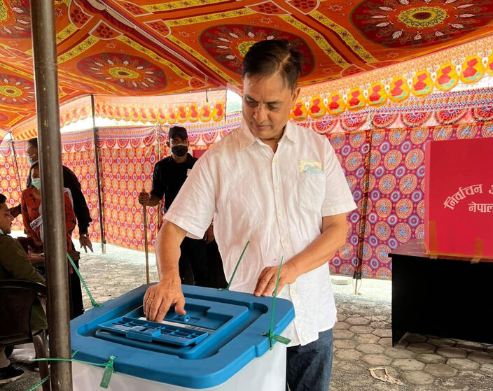 स्थानीय निर्वाचन २०७९ मा मतदान गर्दै हरिवंश आचार्य। तस्बिर : आचार्यको फेसबुक पेज