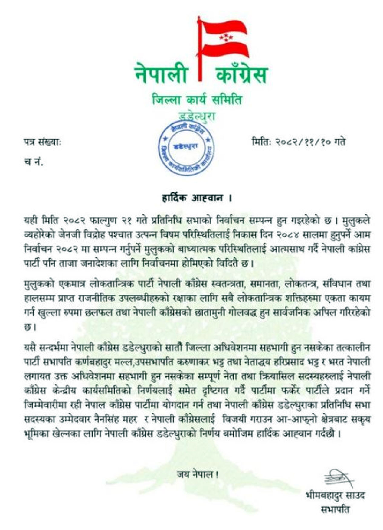 “नेपाली कांग्रेस डडेल्धुराको सातौँ जिल्ला अधिवेशनमा सहभागी हुन नसकेका तत्कालीन पार्टी सभापति कर्णबहादुर मल्ल, उपसभापति करुणाकर भट्ट तथा नेताद्वय हरिप्रसाद भट्ट र भरत नेपालीलगायत उक्त अधिवेशनमा सहभागी हुन नसकेका सम्पूर्ण नेता तथा क्रियाशील सदस्यहरूलाई नेपाली कांग्रेस केन्द्रीय कार्यसमितिको निर्णयलाई समेत दृष्टिगत गर्दै पार्टीमा फर्केर पार्टीले प्रदान गर्ने जिम्मेवारीमा रही नेपाल कांग्रेस पार्टीमा योगदान गर्न तथा नेपाली कांग्रेस डडेल्धुराका प्रतिनिधिसभा सदस्यका उम्मेदवार नैनसिंह महर र नेपाली कांग्रेसलाई विजयी गराउन आ-आफ्नो क्षेत्रबाट सक्रिय भूमिका खेल्नका लागि नेपाली कांग्रेस डडेल्धुराको निर्णयबमोजिम हार्दिक आह्वान गर्दछौँ‚” सभापति साउदद्वारा जारी विज्ञप्तिमा आह्वान गरिएको छ।