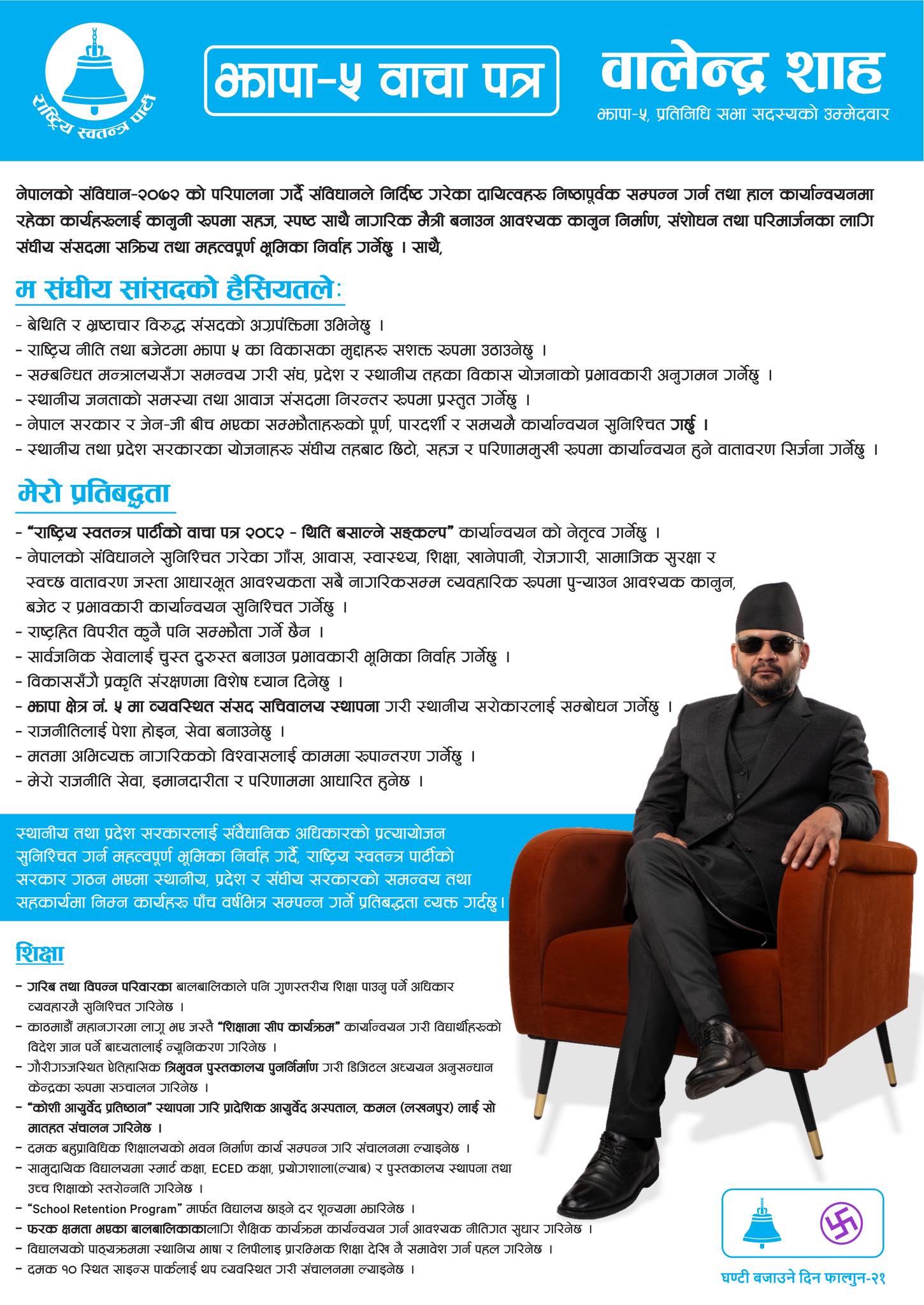 आज आफ्नो वाचा पत्र सार्वजनिक गर्दै उनले रास्वपा सरकार गठन भएको १०० दिनमा आयोग गठन गर्ने र १००० दिनमा समाधान निकाल्ने बाचा गरेका छन् ।
