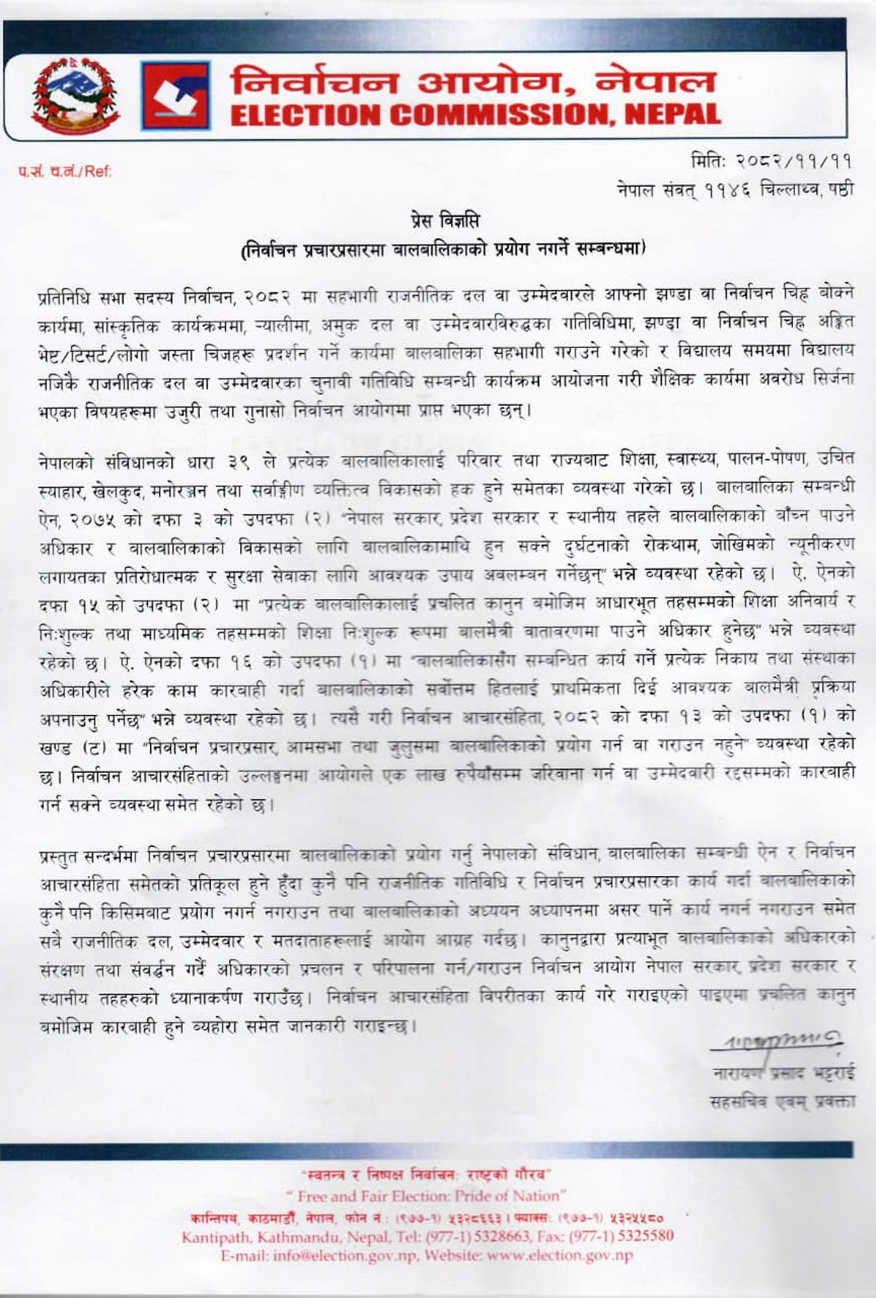 “कुनै पनि राजनीतिक गतिविधि र निर्वाचन प्रचारप्रसारका कार्य गर्दा बालबालिकाको कुनै पनि किसिमबाट प्रयोग नगर्न-नगराउन तथा बालबालिकाको अध्ययन अध्यापनमा असर पार्ने कार्य नगर्न-नगराउनसमेत सबै राजनीतिक दल, उम्मेदवार र मतदाताहरूलाई आयोग आग्रह गर्दछ‚” विज्ञप्तिमा भनिएको छ।