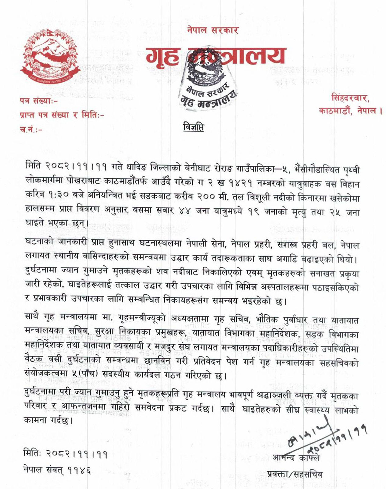 पोखराबाट काठमाडौँतर्फ आउँदै गरेको ग.२ख १४२१ नम्बरको बस आइतबार राति करिब १ बजेतिर दुर्घटना भएको थियो। बस सडकबाट करिब २०० मिटर तल त्रिशूली नदीमा खस्दा १९ जनाको मृत्यु र २५ जना घाइते भएपछि गृह मन्त्रालयमा बसेको बैठकले छानबिन समिति बनाएको हो।
