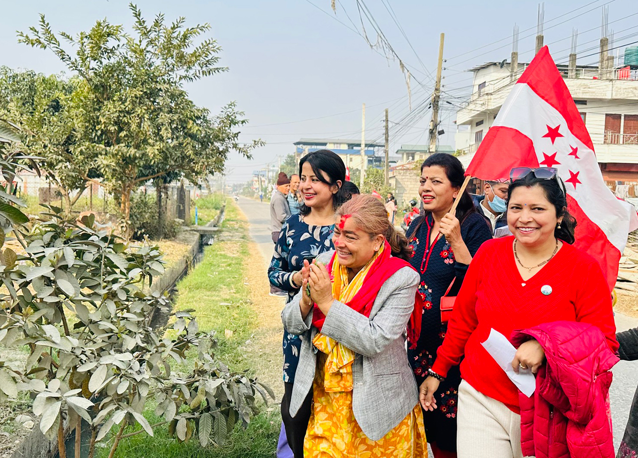 चुनावी प्रचारका क्रममा नेपाली कांग्रेसकी चितवन क्षेत्र २ की उम्मेदवार मीनाकुमारी खरेल। तस्बिर : खरेलको फेसबुक पेज