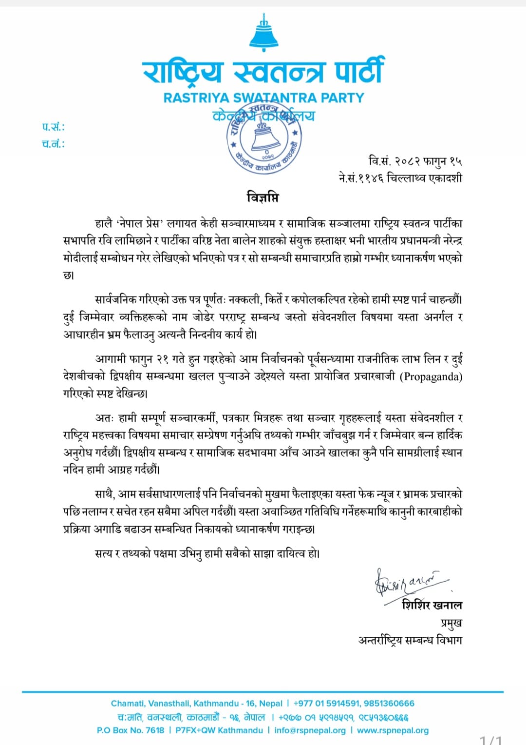 काठमाडौँ । राष्ट्रिय स्वतन्त्र पार्टी(रास्वपा)ले सभापति रवि लामिछाने र वरिष्ठ नेता बालेन शाहको संयुक्त हस्ताक्षरमा भारतीय प्रधानमन्त्री नरेन्द्र मोदीलाई लेखिएको पत्र पूर्ण रूपमा नक्कली र कपोलकल्पित भएको जनाएको छ ।