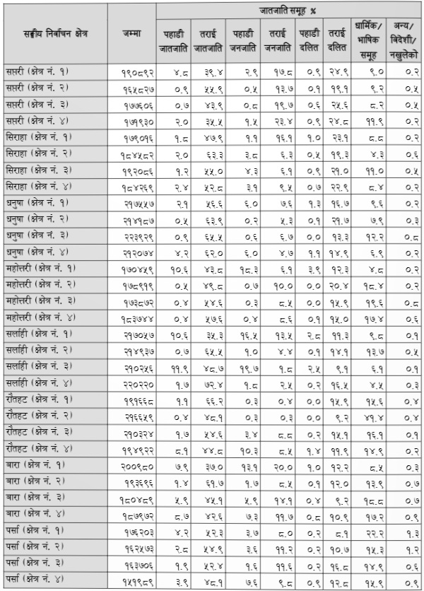 मधेस प्रदेशमा जातजातिको वर्गीकरण र जनसंख्या। स्रोत : निर्वाचन क्षेत्रअनुसार जनसांख्यिक प्रतिवेदन, २०८२/राष्ट्रिय तथ्यांक कार्यालय