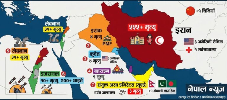 काठमाडौँ। अमेरिका-इजरायलले इरानमाथि सुरु गरेको प्रत्यक्ष सैन्य आक्रमणका कारण मध्यपूर्वका विभिन्न देशमा मानवीय क्षतिको संख्या तीव्र रूपमा बढ्दै गएको छ। पछिल्लो विवरणअनुसार इरान, इजरायल, लेबनान र खाडी मुलुकमा गरी ६ सयभन्दा बढी व्यक्तिको मृत्यु भइसकेको छ। सबैभन्दा ठुलो क्षति इरानमा देखिएको छ। जहाँ संयुक्त अमेरिकी-इजरायली सैन्य कारबाही सुरु भएदेखि अहिलेसम्म ५५५ जनाको मृत्यु भइसकेको छ। … Continue reading मध्यपूर्वमा जारी युद्धमा ६०० भन्दा बढीको मृत्यु, इरानमा मात्र ५५५ हताहती