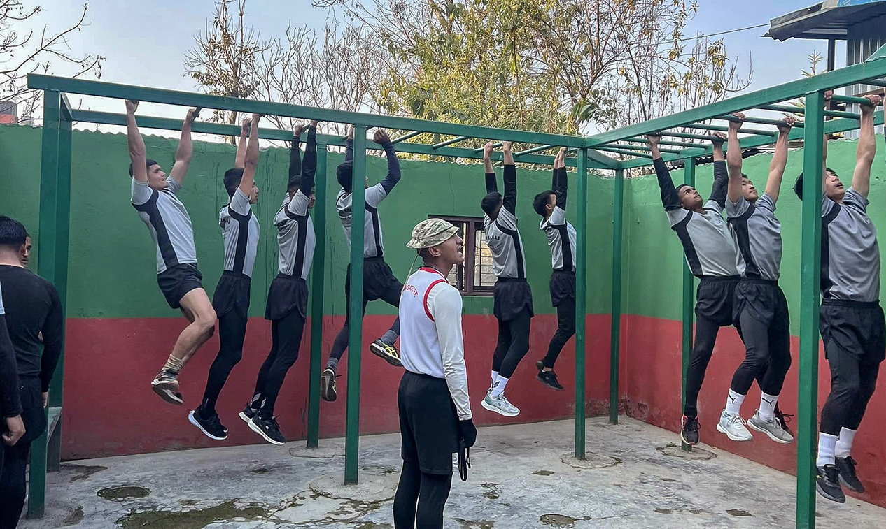 ब्रिटिस गोर्खामा भर्ती हुन तालिम गरिरहेका युवाहरू। तस्बिर : ब्रिटिस गोर्खाज प्रिट्रेनिङ सेन्टर