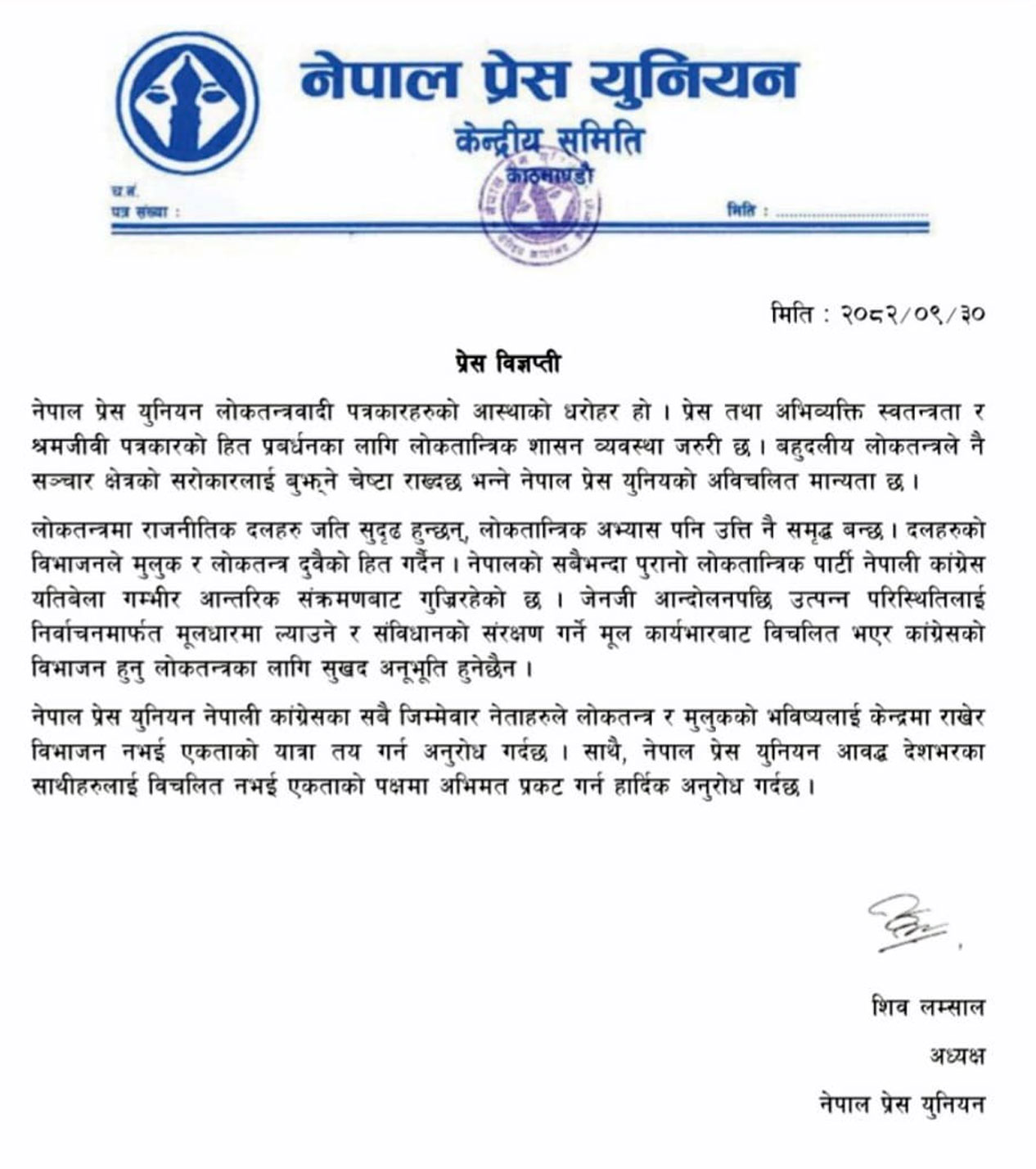 “नेपाल प्रेस युनियन नेपाली कांग्रेसका सबै जिम्मेवार नेताहरूले लोकतन्त्र र मुलुकको भविष्यलाई केन्द्रमा राखेर विभाजन नभई एकताको यात्रा तय गर्न अनुरोध गर्दछ,” अध्यक्ष लम्सालद्वारा जारी विज्ञप्तिमा भनिएको छ।