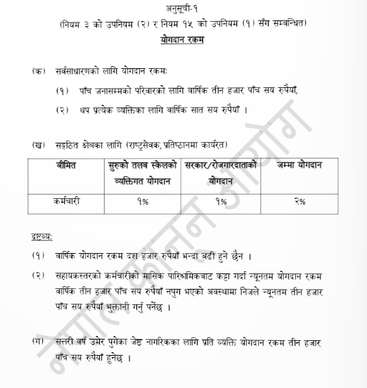 स्वास्थ्य बिमा नियमावली, २०७५ ले पाँच जनासम्म सदस्य भएको परिवारले वार्षिक तीन हजार ५०० रूपैयाँ योगदान गर्नुपर्ने व्यवस्था गरेको छ। यति रकम प्रिमियम तिरेपछि परिवारका ती सदस्यले एक लाख रुपैयाँबराबरको उपचार सेवा पाउँछन्।