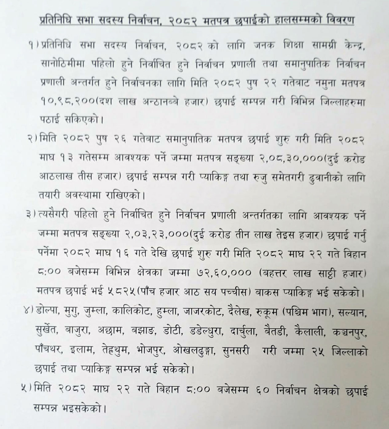 कर्णाली र सुदूरपश्चिम (एकाध जिल्लाबाहेक) प्रदेशको मतपत्र छपाइ सकिएको छ । प्रत्यक्षतर्फ कुल दुई करोड तीन लाख २३ हजार मतपत्र छाप्नुपर्नेछ । समानुपातिकतर्फको दुई करोड चार लाख मतपत्र छपाइ सकेर १६ माघदेखि जनक शिक्षा सामग्री केन्द्र लिमिटेडमा प्रत्यक्षतर्फको मतपत्र छपाइ सुरु भएको थियो ।
