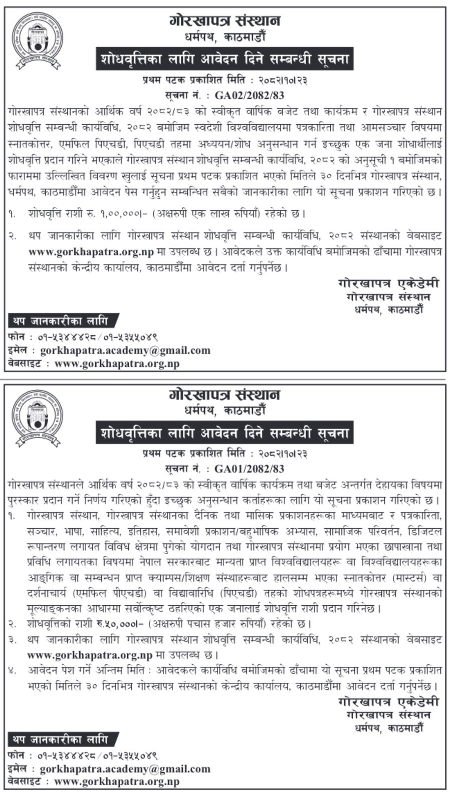 शुक्रबार सूचना प्रकाशित गर्दै संस्थानले गोरखापत्र एकेडेमी अन्तर्गत प्रदान गरिने शोधवृत्ति दुई वर्गको हुने जनाएको छ।