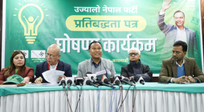 काठमाडौँ। कुलमान घिसिङ नेतृत्वको उज्यालो नेपाल पार्टी (उनेपा) ले चुनावी प्रतिबद्धता-पत्र सार्वजनिक गरेको छ। पत्रकार सम्मेलन गर्दै पार्टीले आइतबार निर्वाचन प्रतिवद्धता-पत्र सार्वजनिक गरेको हो। पार्टीले मुलुकमा सुशासन, समृद्धि र सामाजिक न्यायको लागि स्थापित पार्टी भएको जनाएको छ। प्रतिबद्धता-पत्रमा संविधान, शासन प्रणाली र राज्य संरचनालाई नागरिकमैत्री बनाउने, भ्रष्टाचारविरुद्ध शून्य सहनशीलता कायम गरिने जनाएको छ। त्यस्तै प्रतिबद्धता-पत्रमा … Continue reading उनेपाको प्रतिबद्धता-पत्र : प्रतिनिधिसभा सदस्य संख्या २०१‚ मुख्यमन्त्री प्रत्यक्ष निर्वाचित (पूर्ण पाठ)