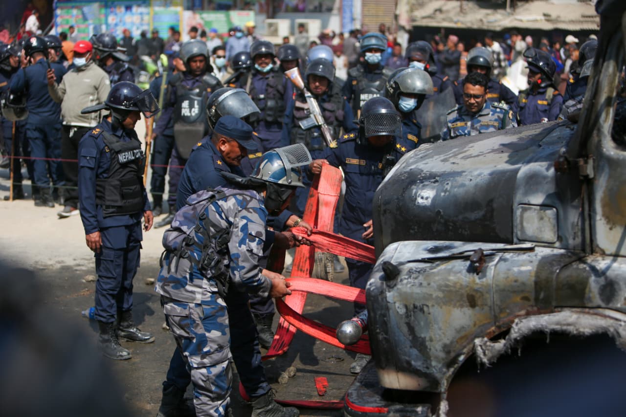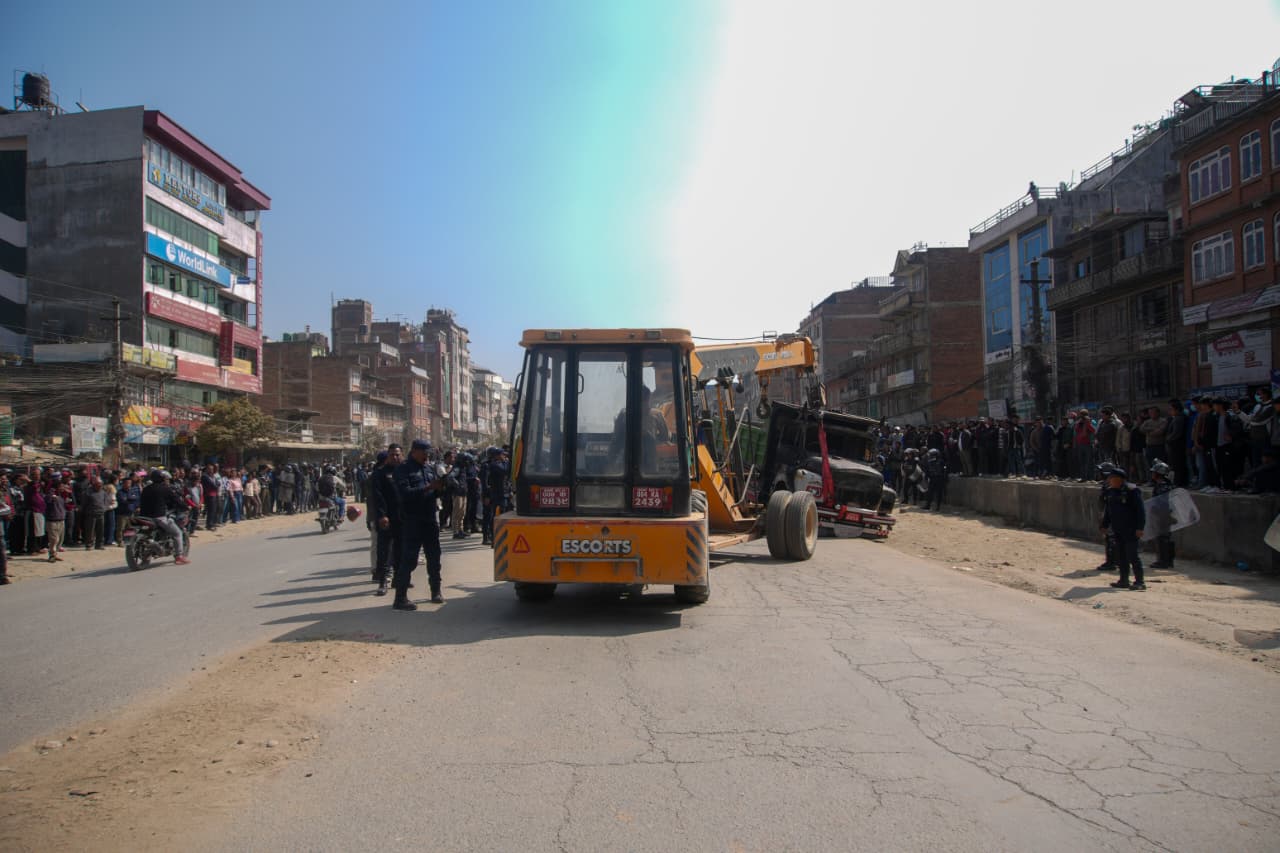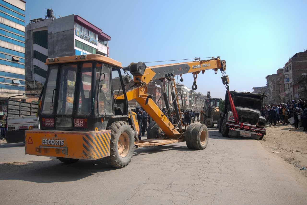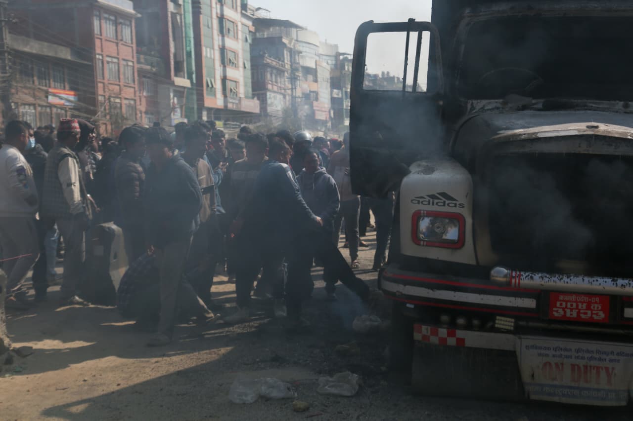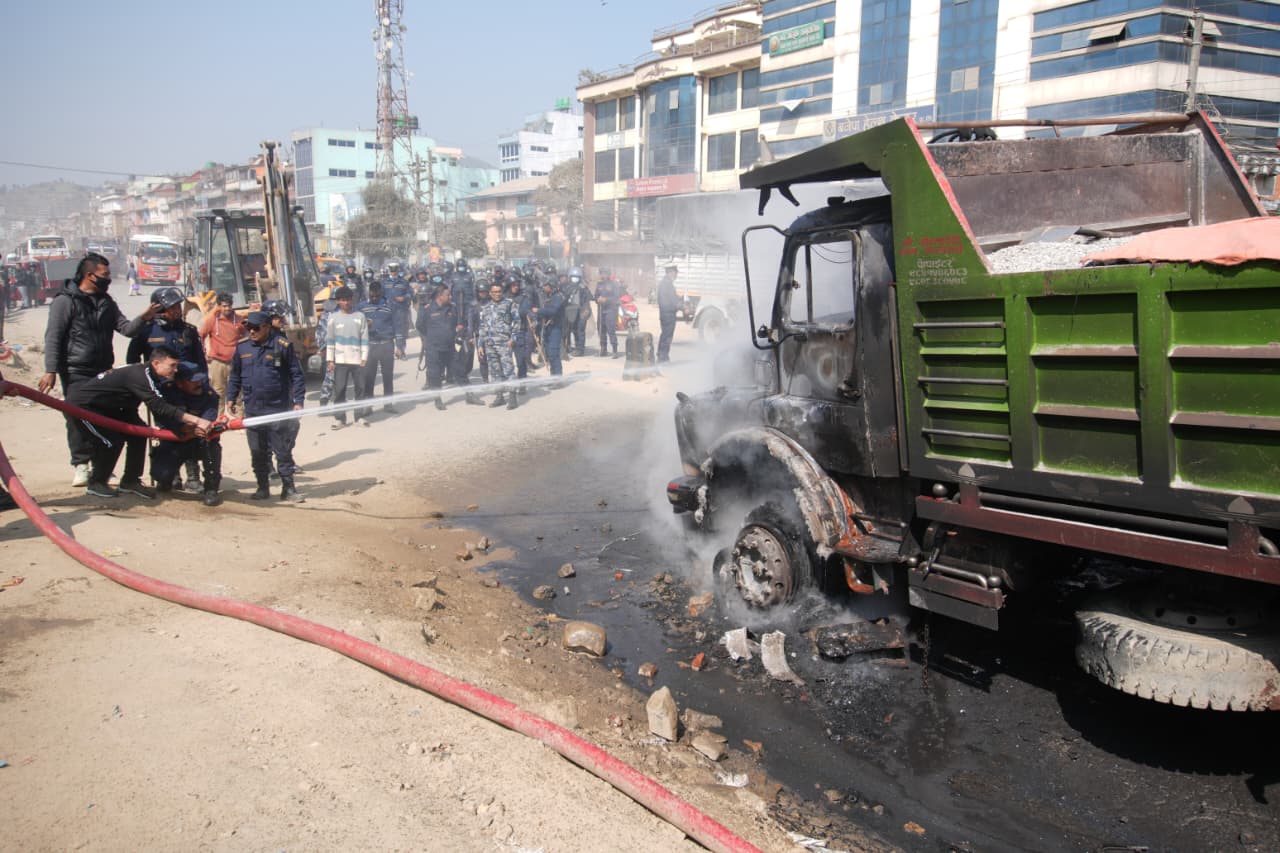 स्कुटरलाई ठक्कर दिने टिपरमा स्थानीय बासिन्दाले आगो लगाएका छन्। आगजनीको कारण यहाँको अवस्था केहीबेर तनावग्रस्त बनेको थियो।
