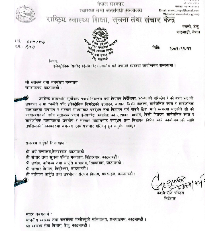 १२ चैत २०८१ मा स्वास्थ्य मन्त्रालयको राष्ट्रिय स्वास्थ्य शिक्षा सूचना तथा सञ्चार केन्द्रले भेप आयात र बिक्रीमा रोक लगाउन गरेको पत्राचार।