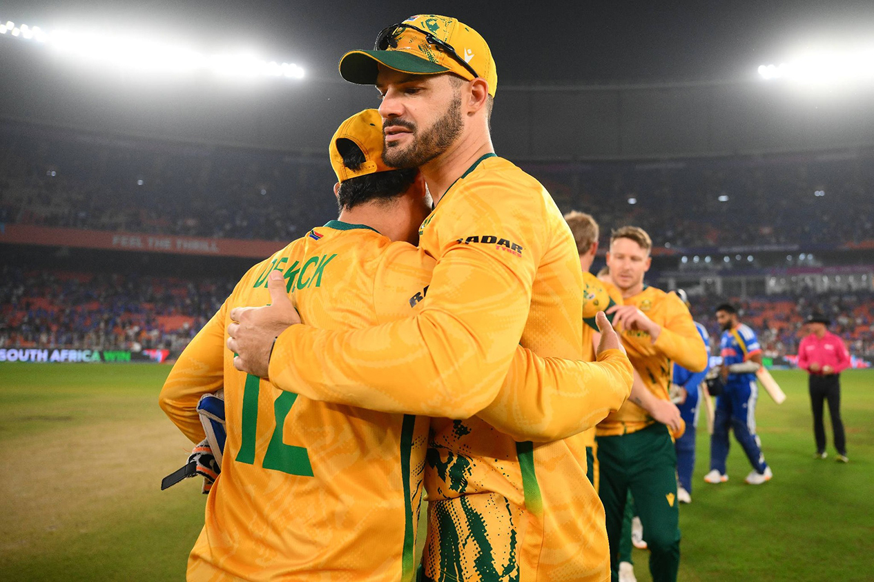 भारतलाई हराएपछि खुसी साट्दै दक्षिण अफ्रिकाका खेलाडी।