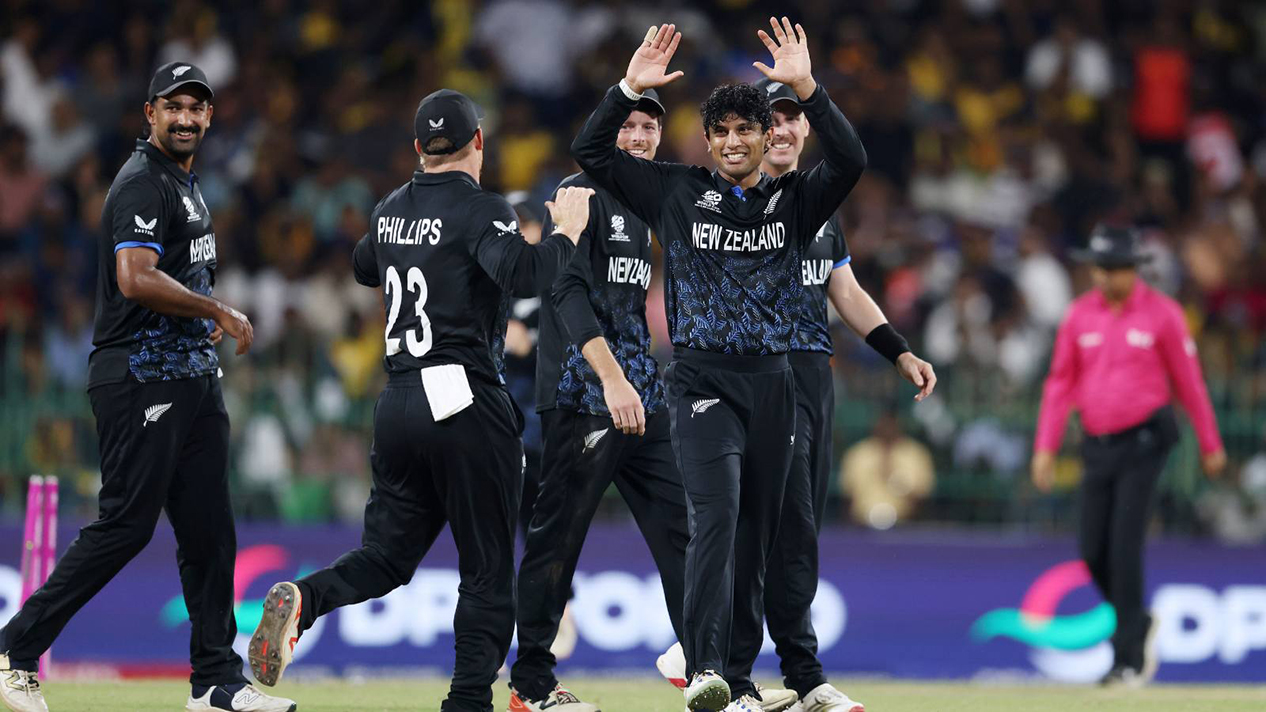 श्रीलंकाविरुद्द चौथो विकेट लिएपछि न्युजिल्यान्डका अलराउन्डर रचिन रवीन्द्र।