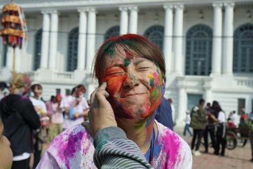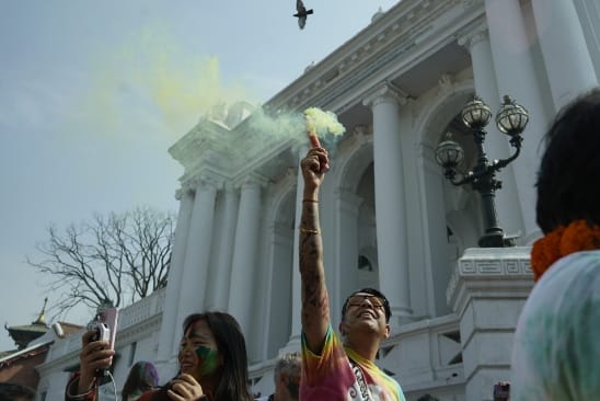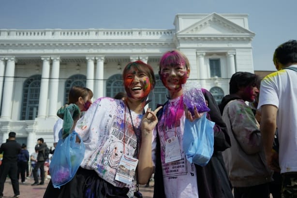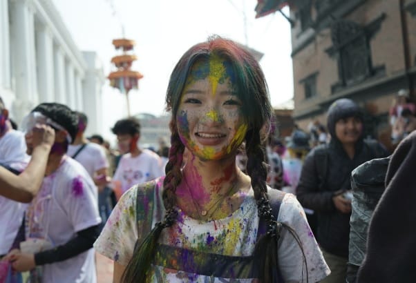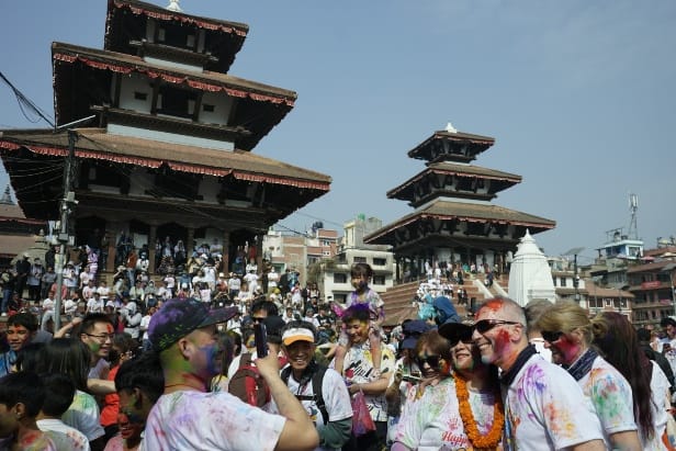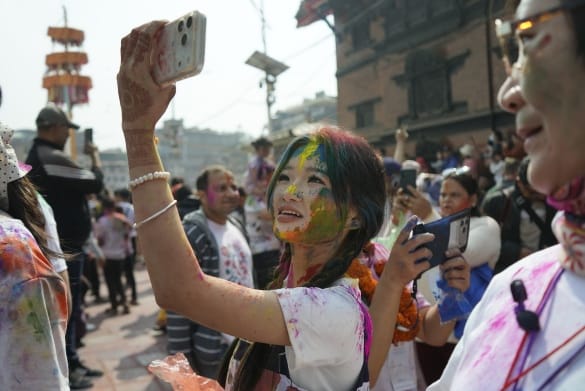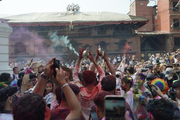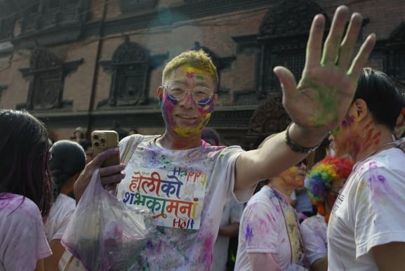 सोमबार काठमाडौँको बसन्तपुरमा विभिन्न देशका पर्यटकहरूले स्थानीयसँग मिलेर आपसमा रंग लगाएर होली खेलेका छन्।